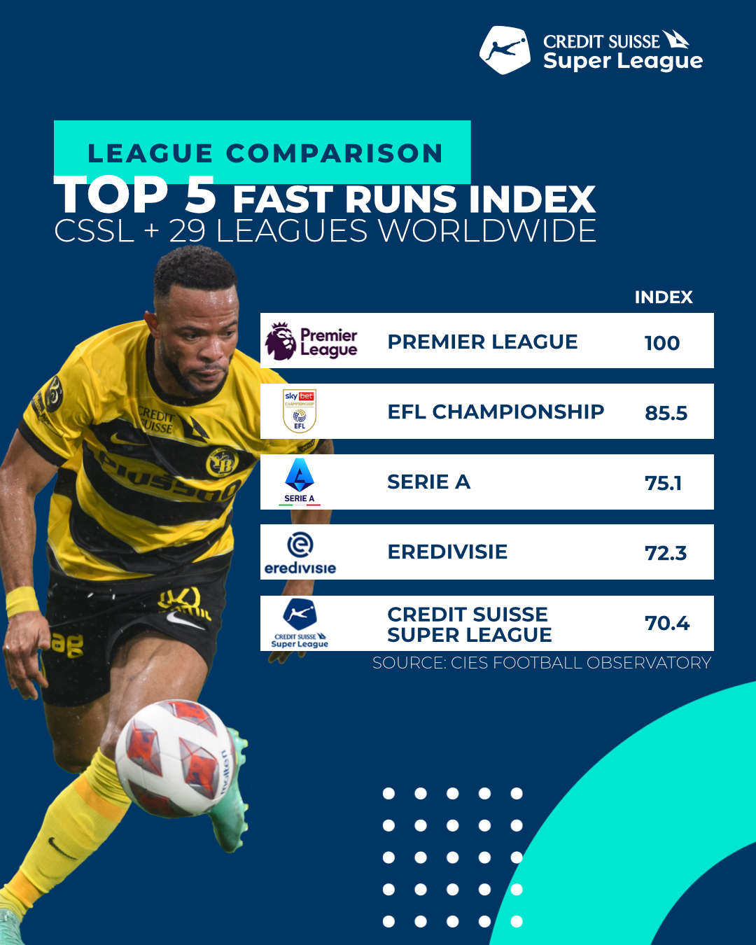 La plus haute ligue de football suisse, la Credit Suisse Super League, affiche une excellente performance dans ces aspects physiques du jeu. Avec un indice de 70,4 pour les sprints, 81,8 pour la vitesse d’action des joueurs, et 78,8 pour les accélérations, les équipes de la Credit Suisse Super League démontrent leur capacité à évoluer au plus haut niveau.