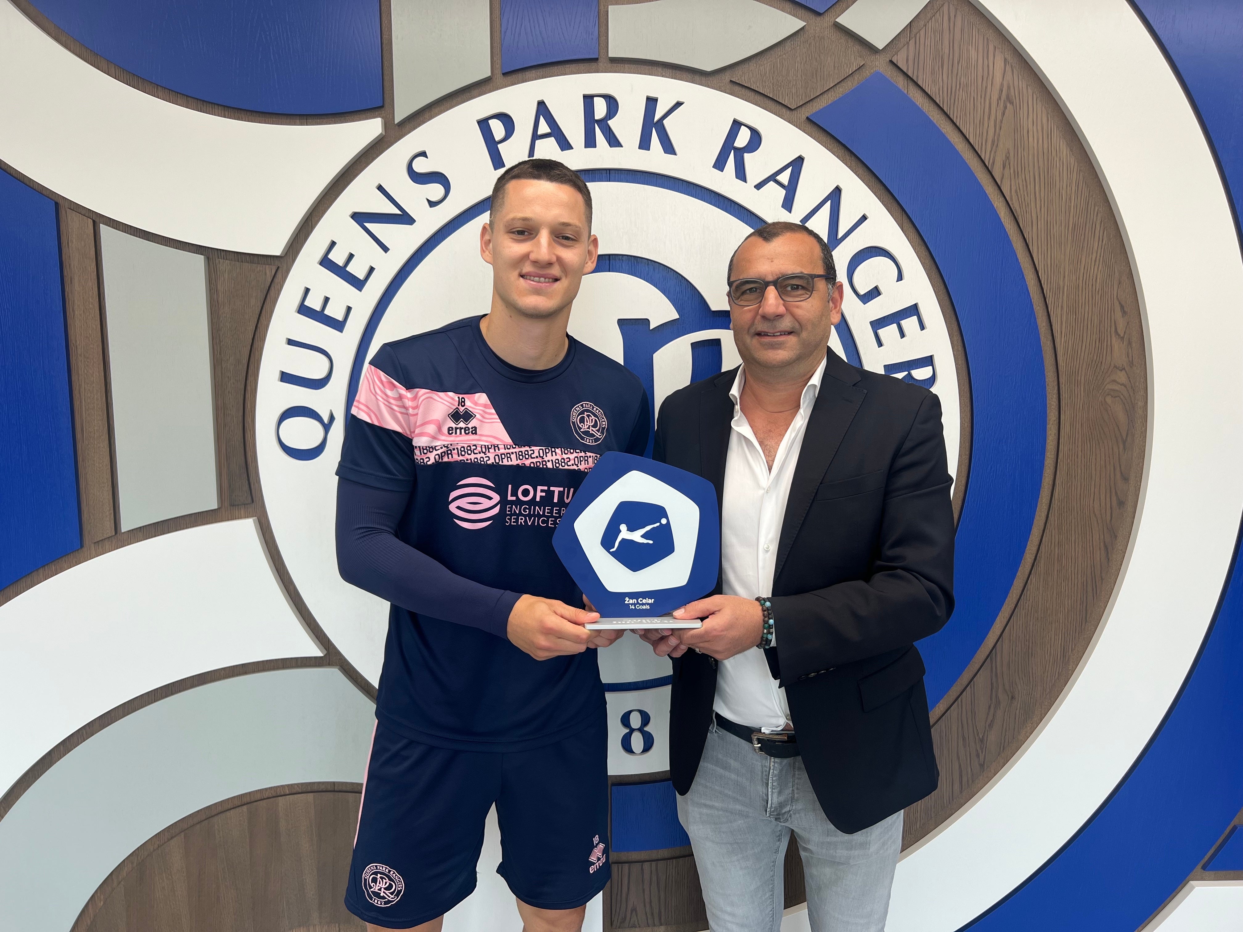 Or, les «Rois des buteurs» sont, cette saison, au nombre de trois. Le troisième meilleur buteur de la saison 2023-2024 est Zan Celar, qui a été honoré en dernier, car le joueur du FC Lugano a été, entre-temps, transféré aux Queens Park Rangers, en Championship anglaise. Il a dû attendre un peu plus longtemps pour recevoir son trophée. Mais la semaine dernière, le moment était venu: Silvano Lombardo, Chief Sports & Competition Officer de la Swiss Football League, a remis son trophée bien mérité à l'attaquant slovène en Angleterre.