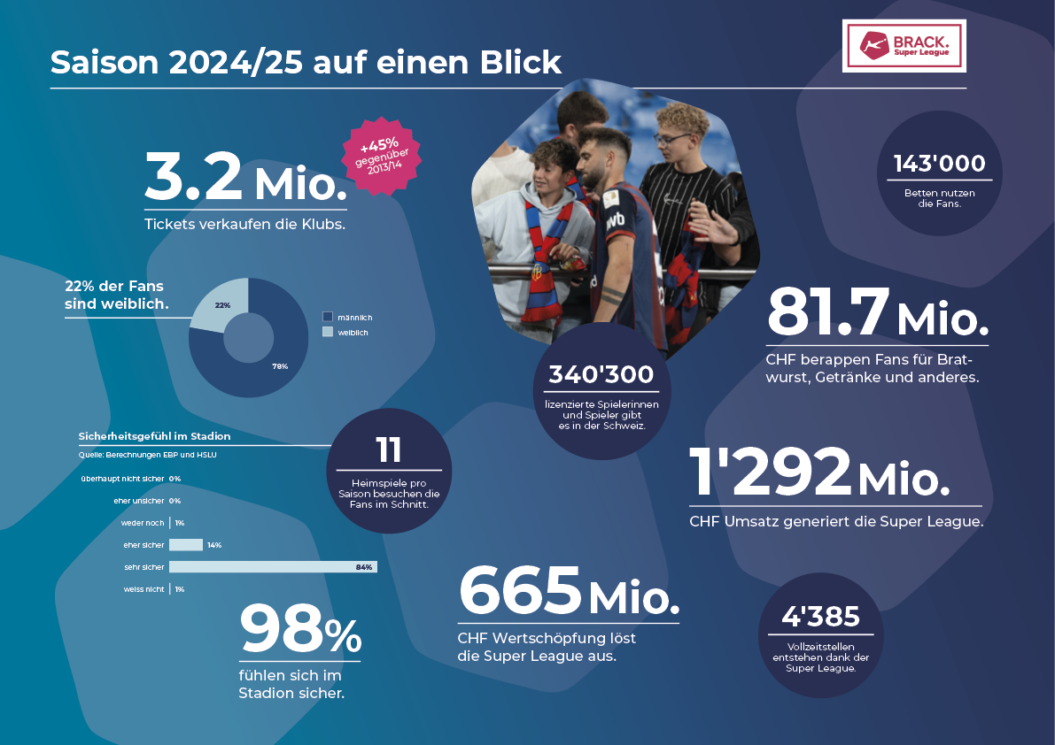 Die Gründe für diese Entwicklung sind vielfältig: Die Aufstockung auf zwölf Klubs, mehr Heimspiele, deutlich höhere Zuschauerzahlen (+45% im Vergleich zu 2013/14), die anhaltend hohe Medienpräsenz, modernisierte Stadien sowie steigende Transfer- und Vermarktungserlöse tragen massgeblich zu dieser Dynamik bei. Auch touristisch hat die Liga eine starke Wirkung: In der Saison 2024/25 entstehen 143'000 Logiernächte, davon 73'000 in der Hotellerie.